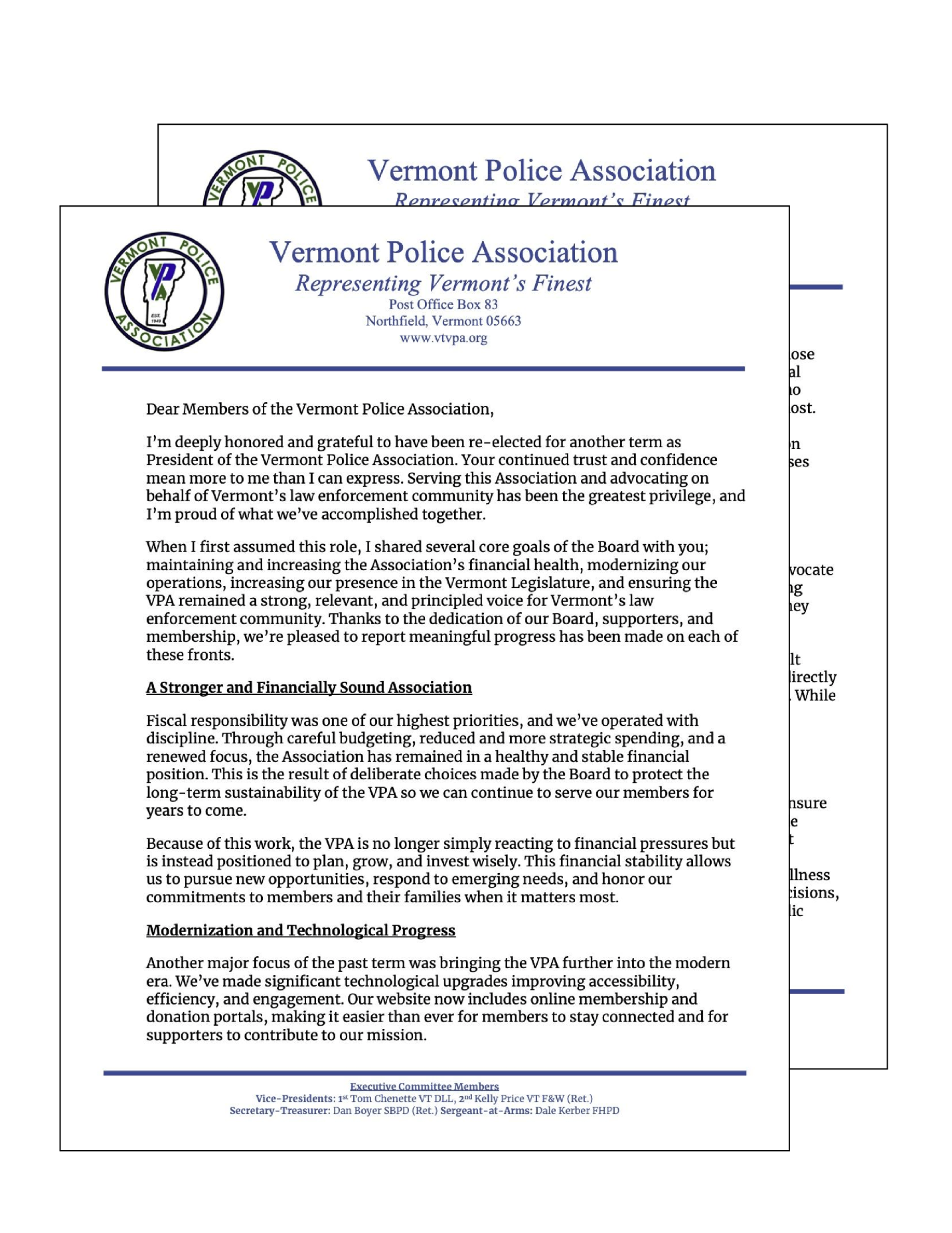 When I first assumed this role, I shared several core goals of the Board with you; and increasing the Association’s financial health, modernizing our operations, increasing our presence in the Vermont Legislature, and ensuring the VPA remained a strong, relevant, and principled voice for Vermont’s law enforcement community. Thanks to the dedication of our Board, supporters, and membership, we’re pleased to report meaningful progress has been made on each of these fronts.